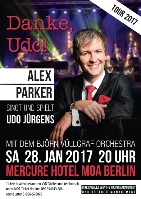 In seinem Konzert Danke, Udo!, das ganz im Zeichen des großen Udo Jürgens steht, singt und spielt Alex Parker eine Auswahl der schönsten Lieder des unvergessenen Entertainers. Mit dieser einzigartigen Udo-Jürgens-Gala zollt der Sänger und Pianist dem wohl erfolgreichsten Komponisten und Musiker der letzten Jahrzehnte sowie einem großartigen Menschen Tribut – Udo Jürgens.